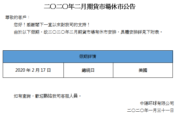 【期貨】二〇二〇年二月期貨市場休市公告